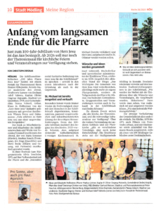 Auch in den Medien ist die Thematik „Herz Jesu“ weiterhin präsent. In den „Bezirksblättern“ erschien dazu ein Artikel an sehr prominenter Stelle. Die Kopie des Zeitungsartikels ist hier abrufbar. Auch in der „Mödlinger Rundschau“ wurde in einem Interview mit Dechant Adolf Valenta davon berichtet. In einem ausführlichen Leserbrief wurde das Interview in der „Rundschau“ bereits aus der spezifischen Sicht der Pfarrmitglieder von Herz Jesu für eine ausgewogenere Darstellung ergänzt. Der Leserbrief soll in der kommenden Ausgabe erscheinen.